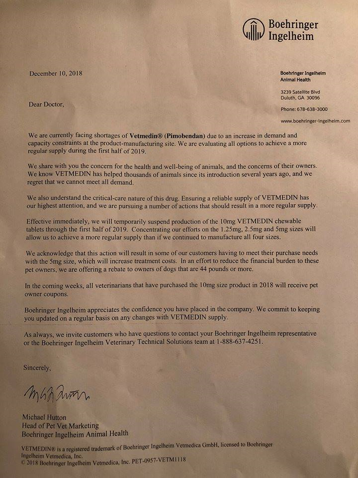 - Boehringer Academy spreads dangerously false information about when MVD-affected dogs should first be treated with Vetmedin. -- December 3, 2020