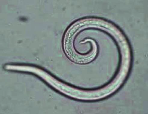 Initially, these worms are carried by slugs and snails and frogs, called transport or intermediate hosts. They then can spread through puddles of water and wet grass to their ultimate hosts, the dogs, or dogs could eat the transport hosts or lick their slime. Once ingested by canines, they penetrate the intestine walls and reach the heart. lungs, and other organs. They also are excreted in feces, where they can survive for several days. Slugs and snails then feast on the feces containing A. vasorum larvae. (Photo at right is of a microscopic view of a first stage larva [L1], courtesy of Bayer Animal Health).