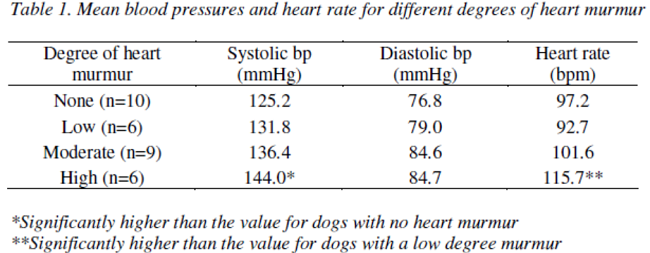 In the same 2007 study, the BP of 31 CKCSs aged from 5 to 14 years were measured to determine the effect of MVD murmurs on BP. See "Table 1" below.
